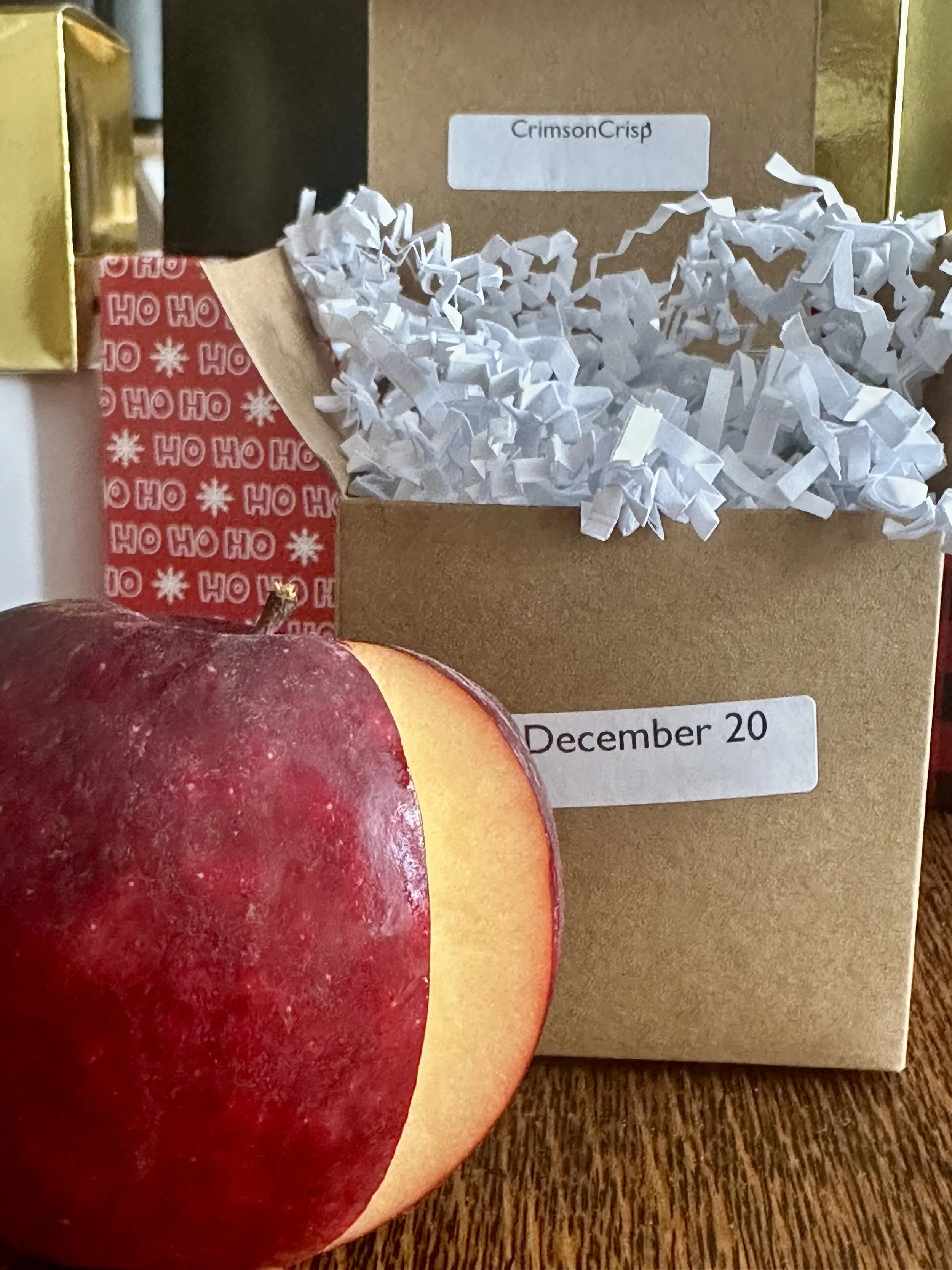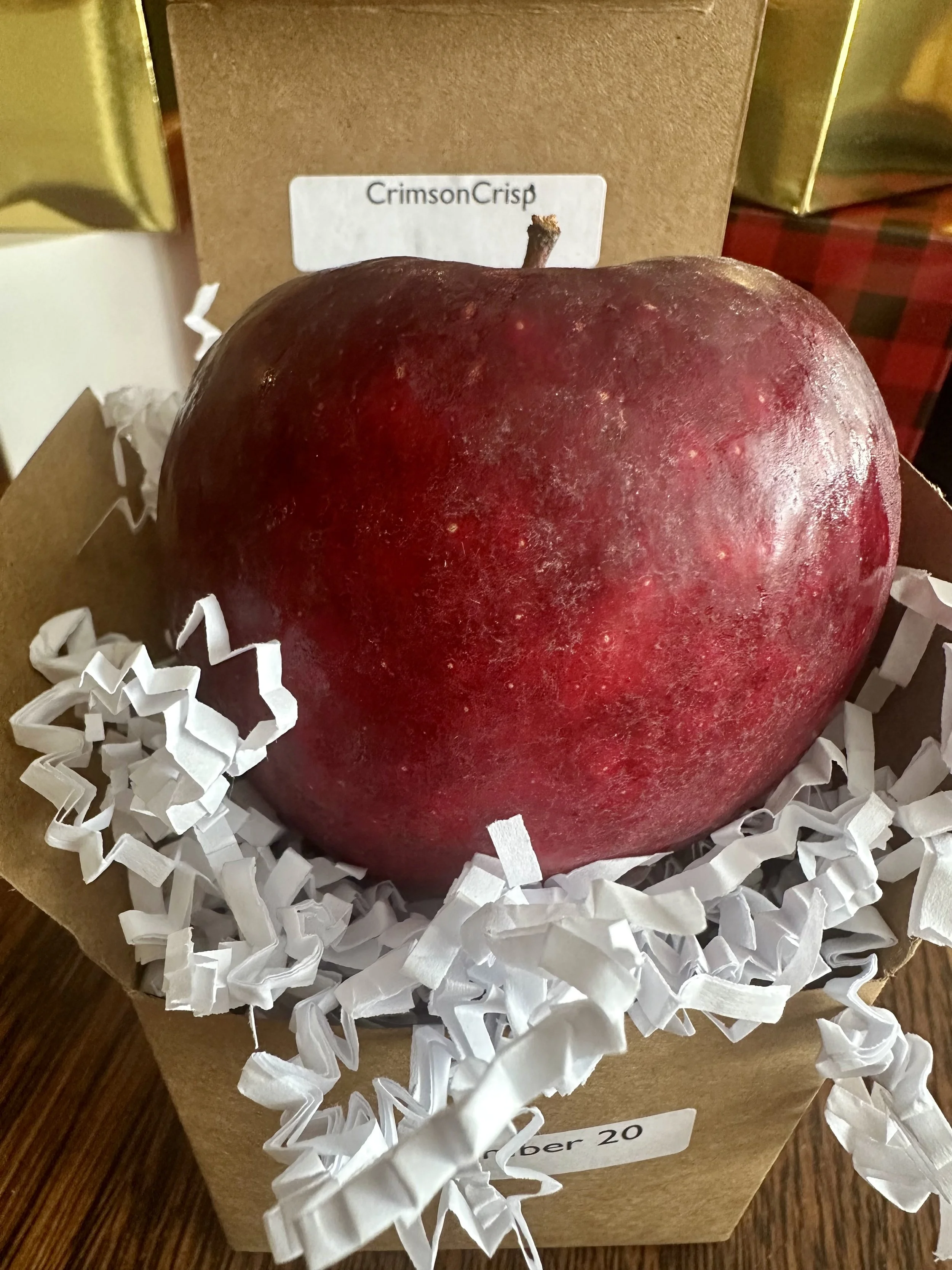 Unlike most apples that use “crisp” in their name, CrimsonCrisp doesn’t have a lick of Honeycrisp in it! Its lineage is completely different, which you can see in the gallery image below. There are well-known varieties in its family tree, to be sure, but the crispness of this apple resulted from a completely different approach than that taken by the U of M in developing Honeycrisp.