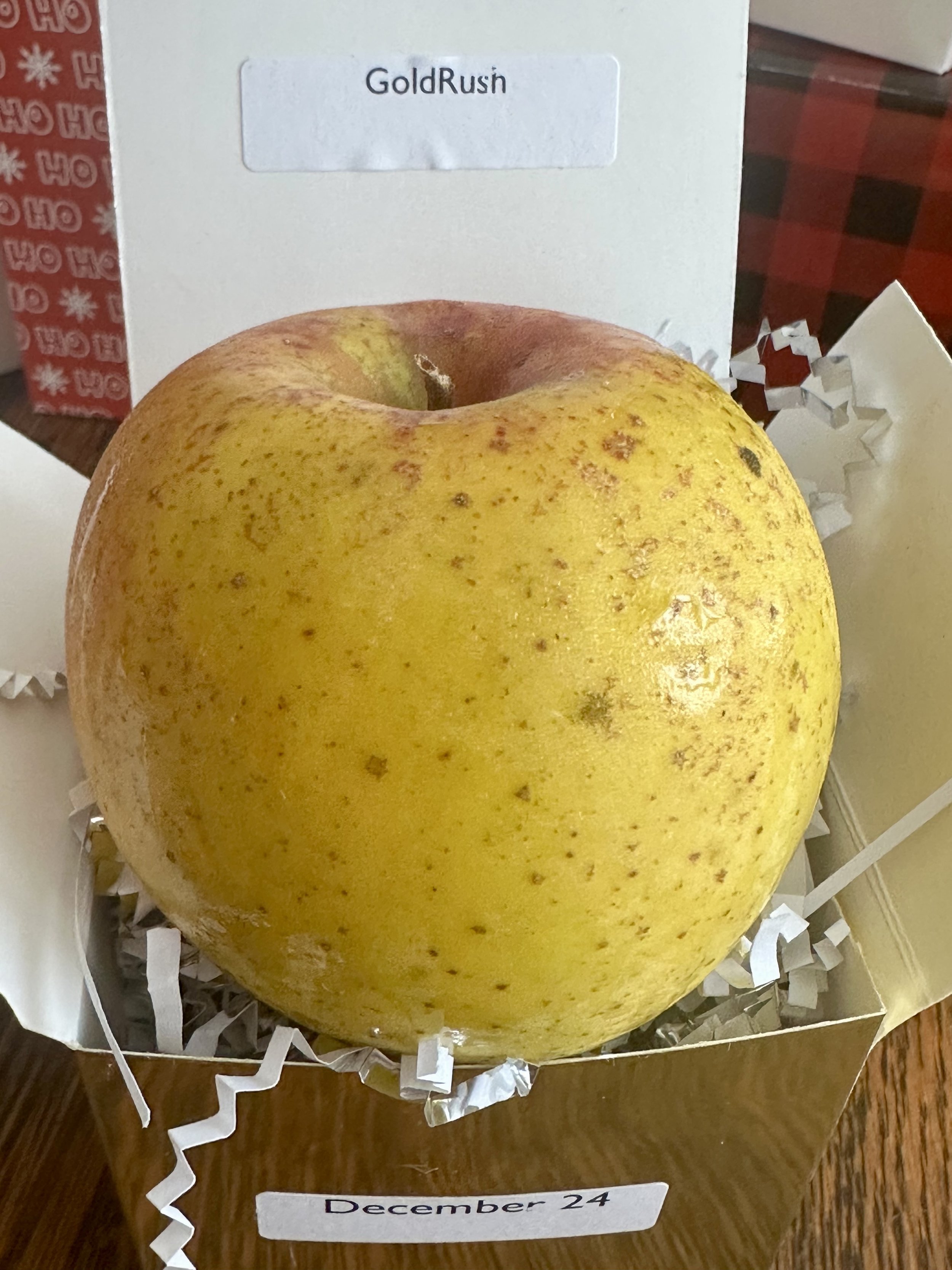 GoldRush is a high-acid, high-sugar, extremely late-harvested apple that is especially popular among organic growers because of its resistance to apple trees’ number one fungal pest, apple scab. If its growing season is long enough, GoldRush offers an intensity of flavor similar to a russeted apple. But if the growing season is short, expect a less striking flavor, just because it didn’t get to fully ripen.